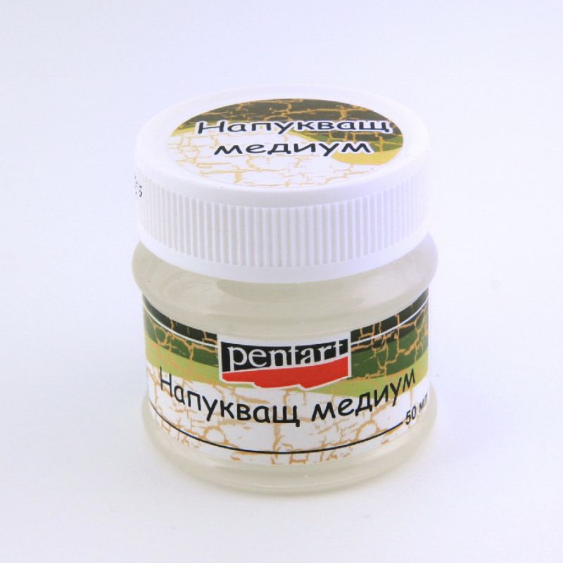 Едностепенният Pentart напукващ медиум придава усещане за античност на всяка повърхност, напомняйки за стара напукана боя. Начин на приложение: Нанесете върху повърхността, която ще декорирате един цвят акрилна боя. След изсъхване нанасете напукващия медиум. В зависимост от пукнатините, които желаете да получите, нанасянето може да става с четка - за хоризонтални или вертикални пукнатини, или с финопореста гъба - за неподредени пукнатини. Обърнете внимание, че когато нанасяте с четка, движенията трябва да са винаги само в една посока - от ляво на дясно или от горе на долу. Видът на пукнатините зависи и дебелината на нанесения слой медиум - колкото е по-дебел, толкова по-изразени ще са те. След изсъхване на медиума, нанесете върху него втори слой акрилна боя, различна по цвят, контрастна на първата. По време на съхнене, вторият слой боя се напуква и в пукнатините се вижда първият слой боя, т.е. напукващият медиум, който е абсолютно прозрачен остава в "сандвич" между двата цвята акрилна боя, напуквайки този над него.