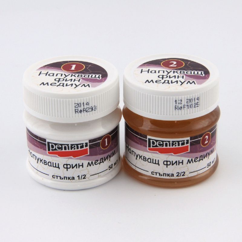 Двустепенният Pentart Фин напукващ медиум имитира напукан горен слой /лаковото покритие/ на стар порцелан. За разлика от еднокомпонентният напукващ медиум, който напуква положения върху него слой акрилна боя, двустепенният се самонапуква. Начин на приложение: Положете компонент 1/2 върху вече декорираната повъхрност - тя може да има всякакъв вид - декупаж, акрилна боя, естествен цвят на дърво, чисто, прозрачно стъкло и др. След изсъхване, положете компонент 2/2. Вторият слой изсъхва, образувайки пукнатини - самонапуква се. За подсилване на ефекта от пукнатините, можете да втриете в тях някаква паста - материал, който не е на водна основа - като напр. Pentart Антична паста или Pentart Течна патина. Остатъкът от Античната паста върху повърхността се отстранява с помощта на памучна кърпа или салфетка. Видът на пукнатините, зависи от посоката на нанасяне на компонентите и дебелината на слоя им. За да съхраните за дълго време, декорирания от Вас предмет, препоръчваме покритие с Pentart Лак гланц солвент.