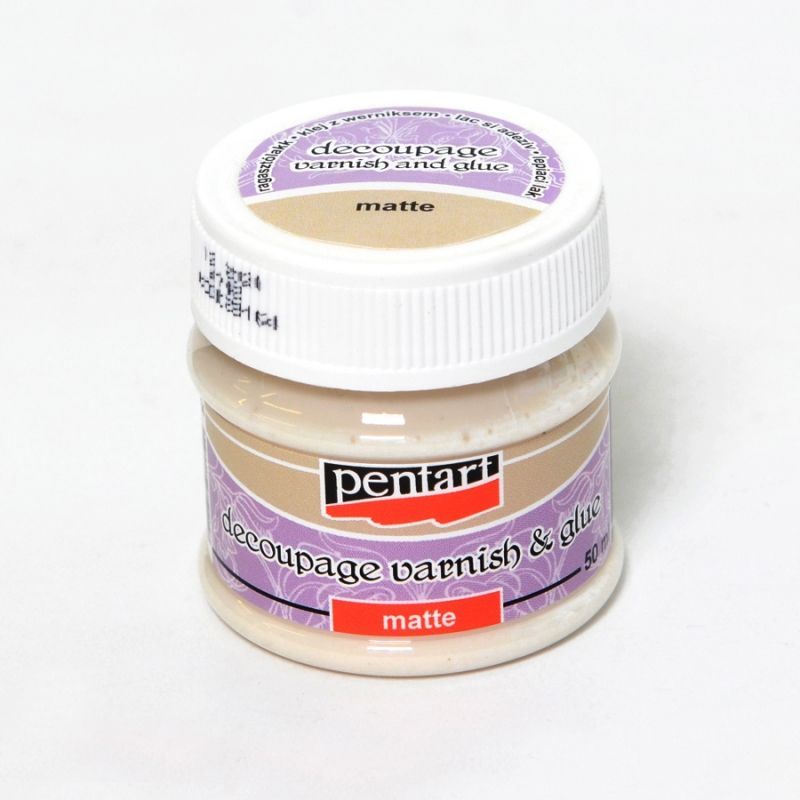 Декупажно лепило и лак в едно - за декупаж с матов завършек. Използвайте за залеяне на декупажна,оризова хартия и салфетки. Нанася се с четка, за предпочитане мека със синтетичен косъм. Изключително добър продукт с по-рядка консистенция, която му позволява добро разнасяне и икономичност при декупаж върху големи площи.