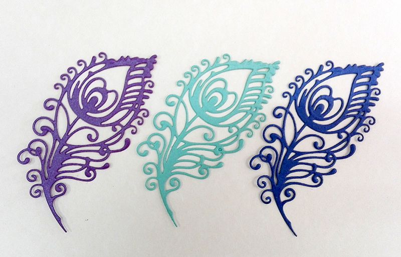 Паунови пера в три цвята перлен картон- лилаво, аквамарин и тъмно синьо