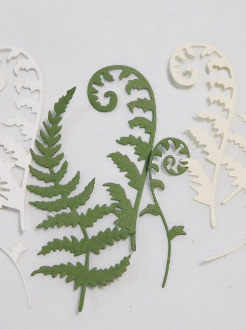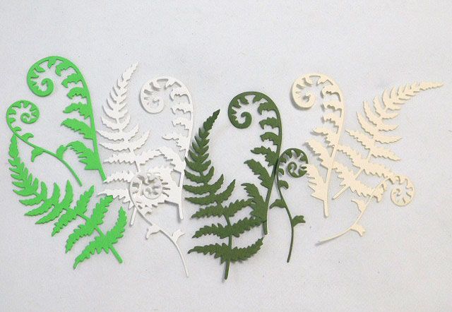 Елементи от хартия - Папрат - 12 елемента, 3 вида, изязани от 4 цвята картон.