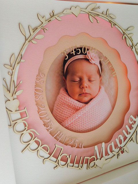 - три слоя от цветен картон с персонализиранни данни - Име, ръст и тегло, дата и час