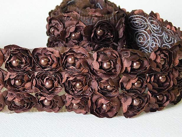Дантела Органза с перли - Кафяво