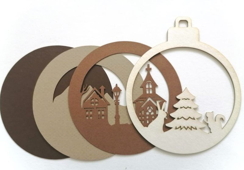 Многопластова топка за декорация включва 1 рамка от бирен картон и 3 броя основи от цветен картон, с който се постига впечатляваща триизмерност.
