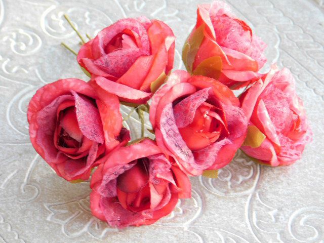 Начало Цветя,листа и тичинки Цветя и клонки Рози - Червено с органза - 6 бр